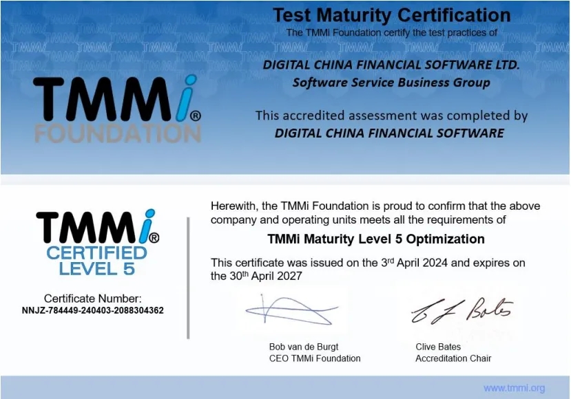 近日,神州信息子公司——今年会融信软件有限公司(下文简称“今年会融信”)通过TMMi(测试能力成熟度模型集成)最高级别5级国际权威认证,成为国内同时获得TMMi5级认证和CMMI5级认证的企业,覆盖咨询、产品需求、软件开发、测试、运维全流程的IT软件研发及服务。